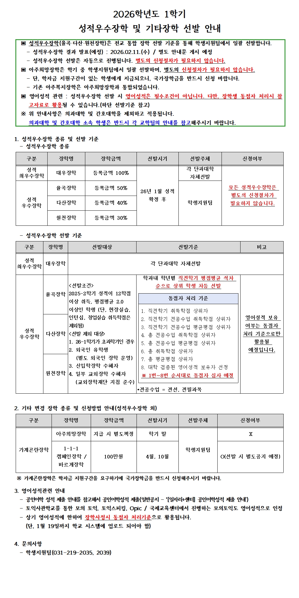 [장학] 2026학년도 1학기 성적우수장학 및 기타장학 선발 안내
