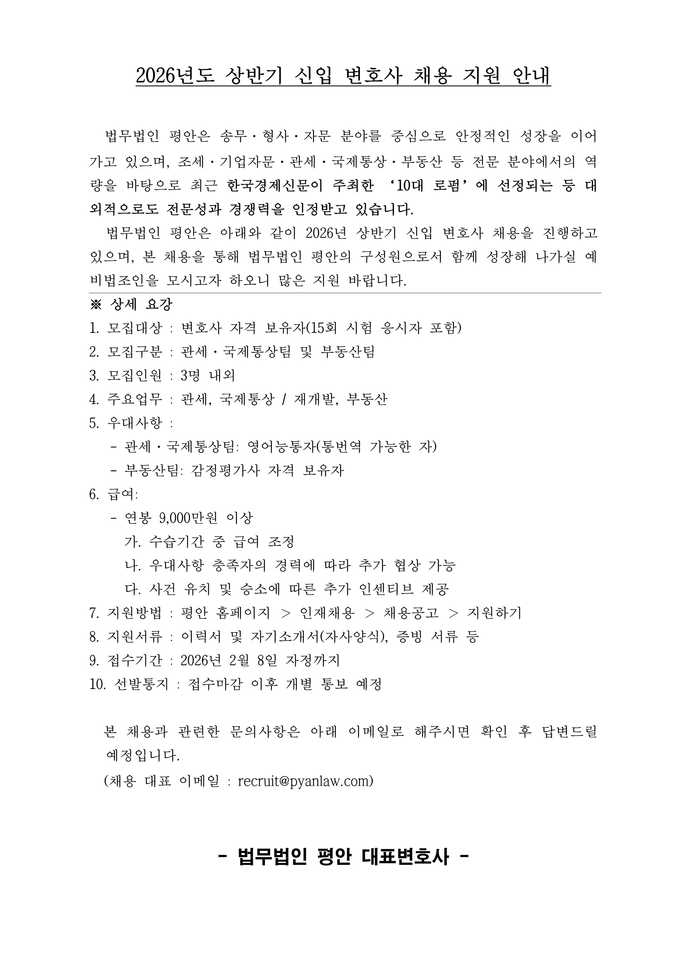 [법무법인 평안] 관세·국제통상팀 및 부동산팀 변호사 채용 안내