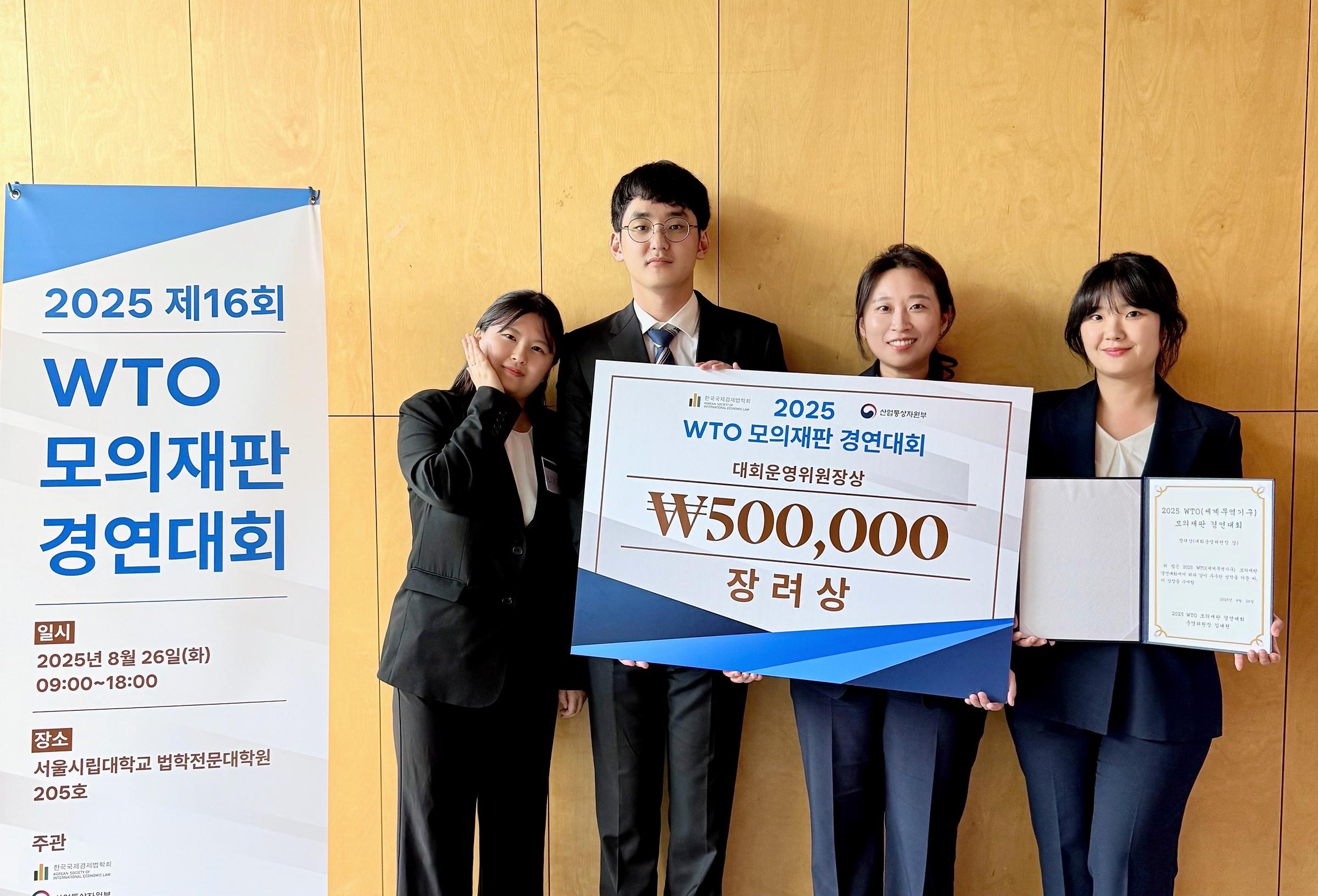 우리 법전원 17기 강동호, 박채은, 안솔지, 이수빈 원생이 2025년 8월 26일 서울시립대학교 법학관에서 열린 ‘제16회 WTO 모의재판 경연대회(주최 : 산업통상자원부, 한국국제경제법학회)’에서 장려상을 수상했다.
