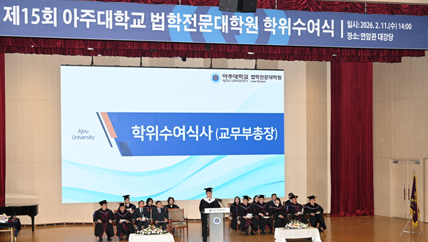 이번 수여식에는 한호 교무부총장, 소병천 법학전문대학원장을 비롯해 임상기 수원지방법원장, 이재진 경기중앙지방변호사회장, 김택빈 동문회장 등 내외빈과 교원 및 졸업생 가족들이 참석해 졸업생들의 새로운 앞날을 축하했다.