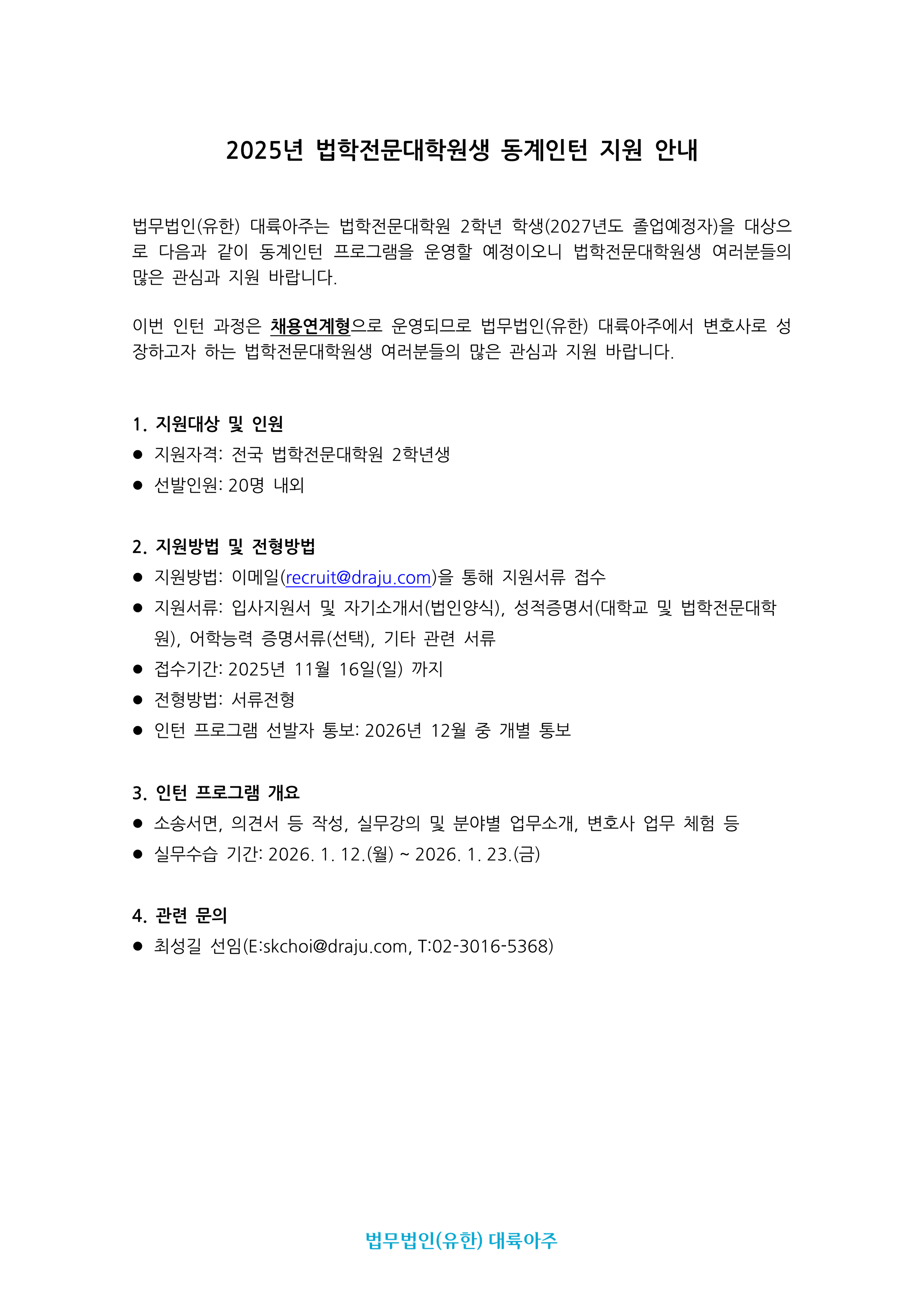 [법무법인(유한) 대륙아주] 2025년 동계인턴 지원 안내